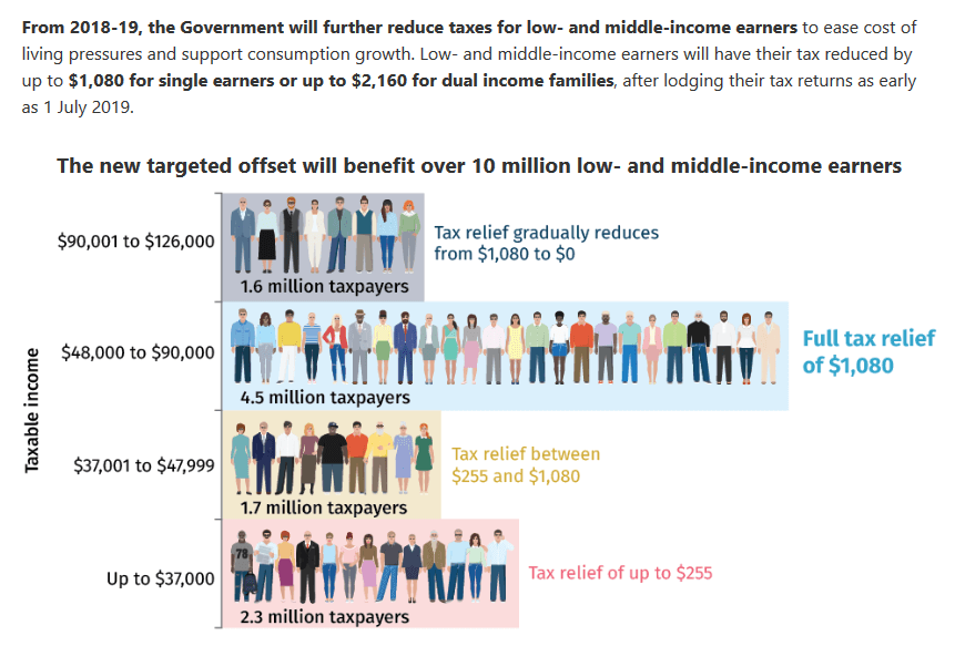 The low and middle income tax offset (LAMITO) of up to $530 was passed in the 18/19 budget. The 19/20 budget has proposed to increase this from $530 to $1,080.* See where you fit in below!